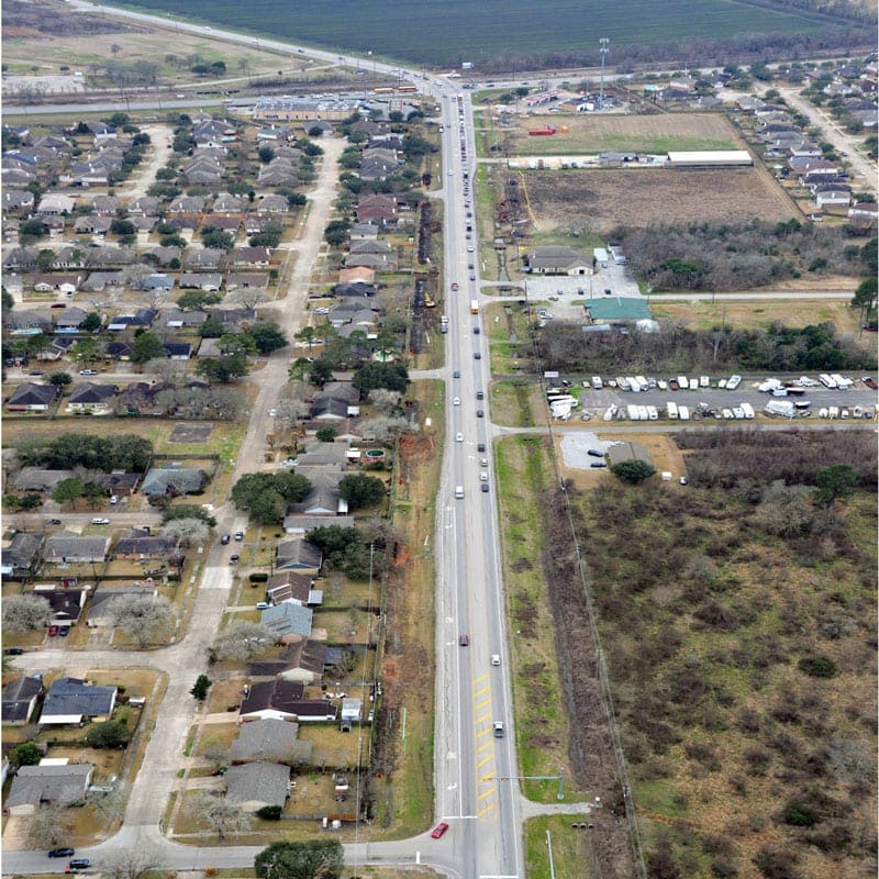Currently a two lane farm-to-market road, the project consists of two phases, first the construction of a new two lane roadway. When completed, traffic will then be diverted to the new roadway while the existing two lanes will be removed and replaced with two new lanes and a continuous turn lane connecting the four main lanes. The proposed pavement section consists of lime stabilization, cement treated base, asphalt bond breaker and concrete paving. New storm utilities, along with a series of three detention ponds, will also be constructed.